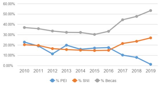 Como también se puede ver en la gráfica, el porcentaje asignado al PEI sufrió una importante reducción en los últimos dos años del sexenio pasado, pues pasó de 17.55% en 2016 a 8.04% en 2018; en este mismo periodo, tanto el presupuesto destinado a becas de posgrado (que pasó del 33.31% al 47.78%), como el del SNI (que pasó de 14.92% a 23.65%), incrementaron notablemente. Surge una duda inevitable ¿el financiamiento a la industria ha mermado el financiamiento otorgado a la formación y consolidación de recursos humanos?