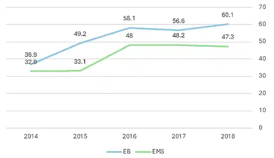 Gráfica 1. Idoneidad de concursos del SPD en el ingreso a EB y EMS (2014-2018)