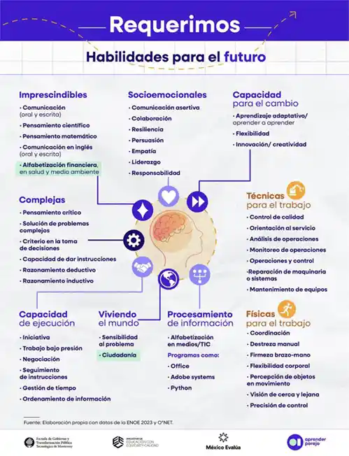 Consideramos que entre las tomadoras y los tomadores de decisiones hacen falta propuestas basadas en evidencia para apoyar al estudiantado mexicano. En Aprender parejo analizamos algunas de las dimensiones más relevantes del ecosistema educativo mexicano. Por ejemplo, en el informe Habilidades para el siglo XXI y la transición al mercado laboral proponemos un consenso sobre habilidades clave indispensables tanto para el desarrollo personal como para la inserción eficaz en el mercado laboral. Estas treinta habilidades fueron seleccionadas por su relevancia, capacidad de adaptación y aplicabilidad en diversos contextos. Algunas de éstas son la comunicación efectiva, que juega un rol crucial en la interacción y colaboración en todos los ámbitos; el pensamiento matemático, indispensable para la toma de decisiones informadas; el dominio del inglés, que abre las puertas al escenario global; o el pensamiento crítico, esencial en esta época de campaña para diferenciar las propuestas políticas de las estrategias de mercadotecnia.
