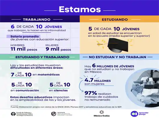 Es crucial que las políticas no únicamente mejoren la calidad educativa, sino que también aseguren que el aprendizaje sea una herramienta efectiva para acceder a mejores oportunidades laborales. Hoy en día, sólo tres de cada diez personas universitarias trabajan en su campo de estudio, lo cual no las exime de enfrentar un primer empleo caracterizado por la informalidad, situación que afecta a un 60 % de dicha población. Lo anterior se agrava con una persistente brecha salarial de género, donde el salario mensual promedio de los hombres jóvenes que estudiaron el nivel superior alcanza casi los 11 000 pesos, mientras que las mujeres jóvenes perciben 2000 pesos menos. Además, si eres mujer, existe una alta probabilidad de que gran parte de tu tiempo fuera de la escuela lo destines al trabajo de cuidados no remunerado, con un 30 % de las mujeres jóvenes involucradas en estas tareas, en contraste con sólo un 8 % de los hombres.