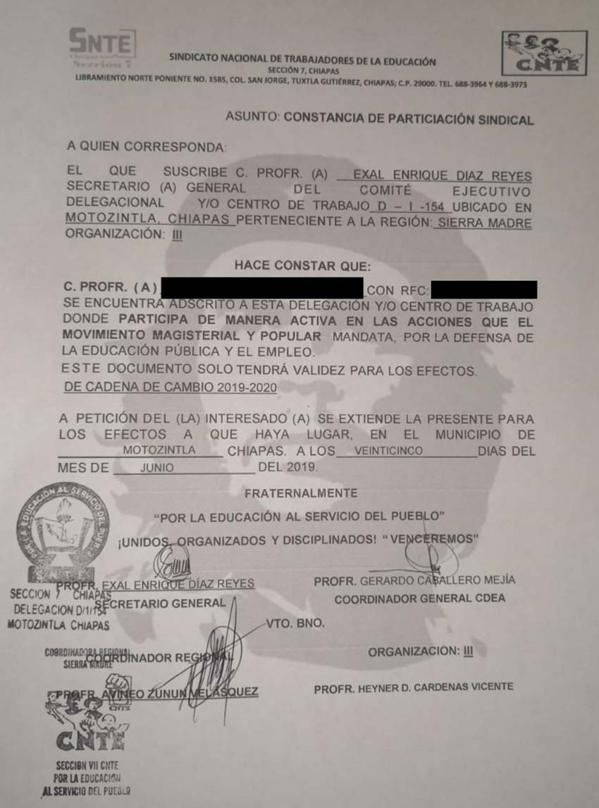 En una constancia de participación sindical, impresa con la imagen de Ernesto Che Guevara en sello de agua, se lee que el secretario general de la delegación D-I-154 de Motozintla: