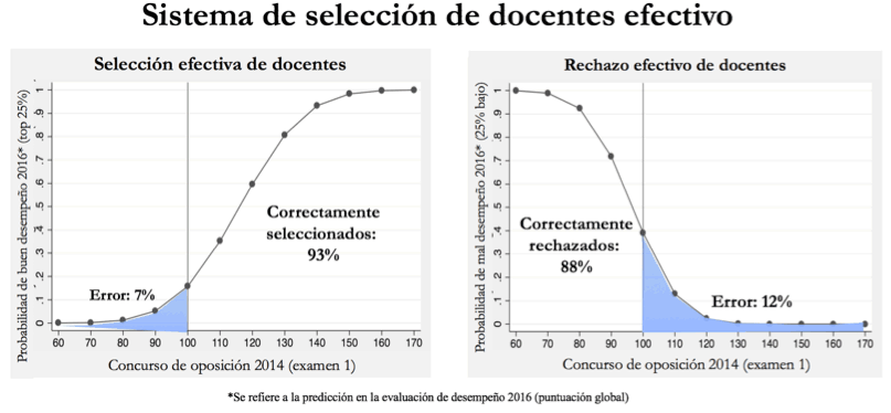 Los exámenes del concurso de oposición y la evaluación de desempeño son parecidos en método y contenido, lo que sugiere una evidencia de validez predictiva sobreestimada. No obstante, incluso analizando sólo la relación entre los exámenes 1 y 2 y la planeación argumentada (instrumentos completamente diferentes), los resultados se mantienen. Por su puesto hay que ser cautelosos. De hecho, otro método estadístico innovador calculó las tasas de error del concurso de oposición. Por un lado, se identificó que 7% de los concursantes que no entraron al SPD pudo haber estado entre el mejor 25% de los maestros, según una predicción de su evaluación de desempeño (falsos negativos). Por otro lado, 12% de los concursantes que sí entró al SPD se encontró entre el peor 25% de los maestros, según una predicción de su evaluación. Los últimos son los falsos positivos del proceso de selección docente, que representan el peor de los errores, pues podrían ser malos docentes que están frente a un aula. Sin embargo, a pesar de estos errores, el concurso de oposición fue efectivo para correctamente seleccionar a los buenos docentes y dejar fuera a quienes no lo serían.