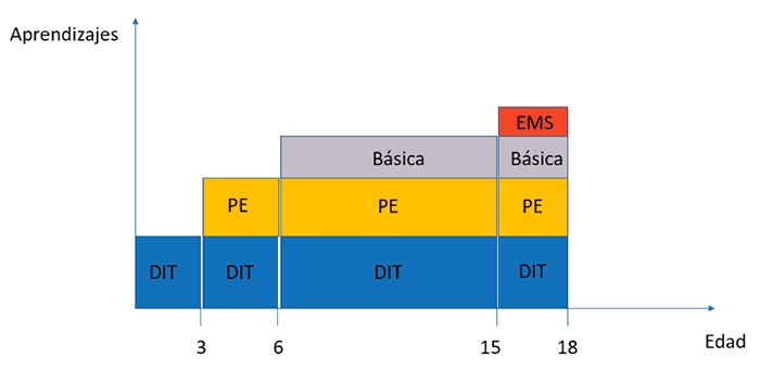 Una de las áreas de la economía de la educación en donde más han contribuido los tres investigadores es en estrategias para mejorar los aprendizajes, especialmente entre los más pobres, que suelen ser también los estudiantes con más rezago educativo. Quizá más que cualquier otro grupo de investigadores, Duflo, Banerjee y Kremer han demostrado que los sistemas educativos tienen un diseño que promueve la desigualdad en acceso a aprendizajes. Esto está relacionado con la generación de aprendizajes, la cual sigue un proceso acumulativo en donde los primeros son necesarios para adquirir los subsiguientes. Como se muestra en la figura 1, entre los 0 y los 3 años, el desarrollo infantil temprano (DIT) provee las bases para poder adquirir los aprendizajes y habilidades que se desarrollan durante el preescolar (PE) y estos son necesarios para el desarrollo de los aprendizajes y habilidades que se adquieren durante la educación básica y media superior (EMS).