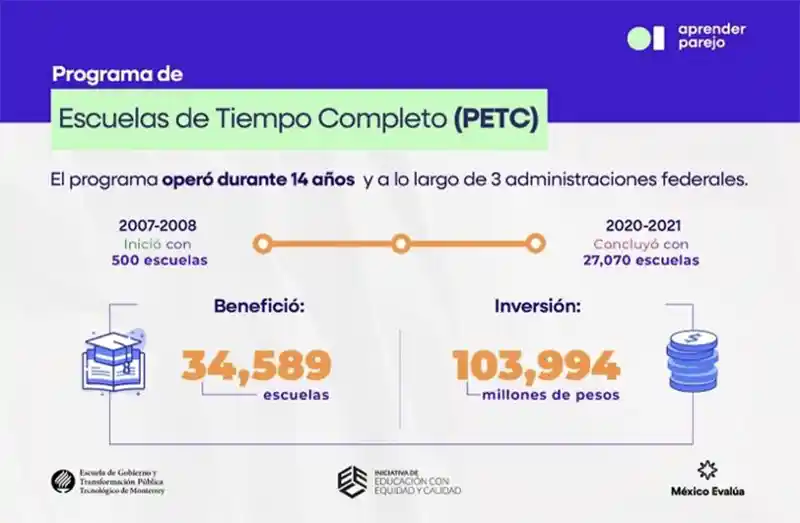 El PETC operó durante catorce años y benefició a 34 589 escuelas. El 19.6 % de las escuelas de educación básica susceptibles de implementar la extensión de horario —este porcentaje considera escuelas de nivel preescolar, primaria y secundaria públicas que operan en planteles sin servicios educativos en contraturno— participaron al menos en una ocasión en el programa.