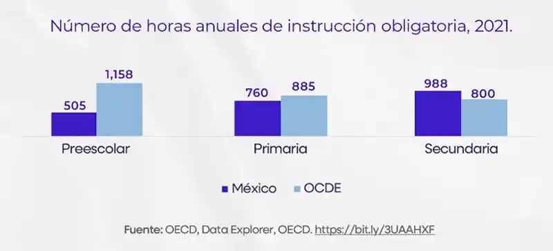 La Gráfica 1 reporta la cantidad de horas anuales de enseñanza obligatoria para México y el promedio para la OCDE, para preescolar, primaria y secundaria. Al respecto, se observa cómo, para preescolar, el promedio de horas anuales de la OCDE es 129 % superior al de México, 16 % superior en primaria y 19 % inferior para secundaria.