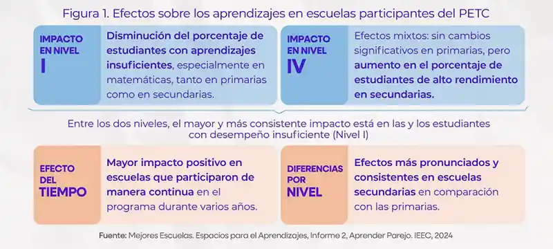 La Tabla 1 presenta las diferencias de aprendizajes entre los niveles de logro (más bajo y más alto) y niveles educativos; la Figura 1 reporta los hallazgos principales del impacto del PETC.