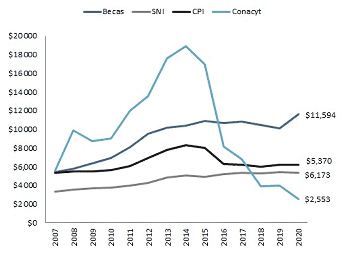 El presupuesto para el SNI, así como el correspondiente a los programas de becas, observan un crecimiento constante de 2003 a la fecha, lo que se deriva del continuo incremento del número de integrantes del SNI así como del incremento en la asignación de becas. El presupuesto para los CPI también es creciente en el periodo, aunque en 2016 registra una disminución importante al descender de 6.6 a 5.6 millones de pesos (8.0 y 6.3 en miles de millones de pesos de 2020) al año siguiente.