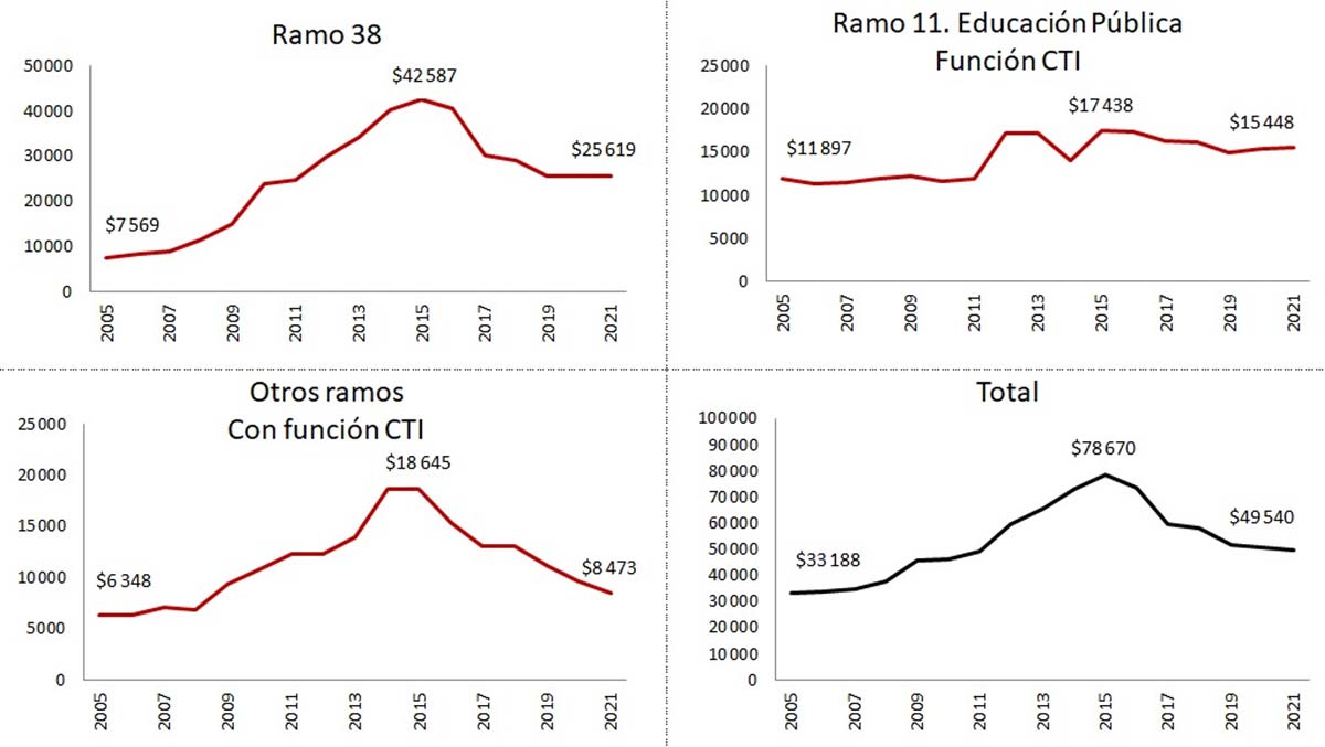 2. El presupuesto de la Función Ciencia, Tecnología e Innovación. Es una de las funciones del grupo “desarrollo económico” conforme a la clasificación establecida por el Consejo Nacional de Armonización Contable. Además del presupuesto íntegro del Ramo 38, la función CTI comprende parcialidades de otros ramos (Agricultura y Desarrollo Rural, Comunicaciones y transportes, Economía, Educación Pública, Salud, Medio Ambiente y Recursos Naturales); además, una porción del Ramo 23 (Provisiones Salariales y Económicas), y recursos aplicables a ciencia y tecnología del IMSS el ISSSTE. El cálculo del presupuesto correspondiente asciende este año a 51.3 miles de millones, sin considerar el rubro de ingresos propios.
