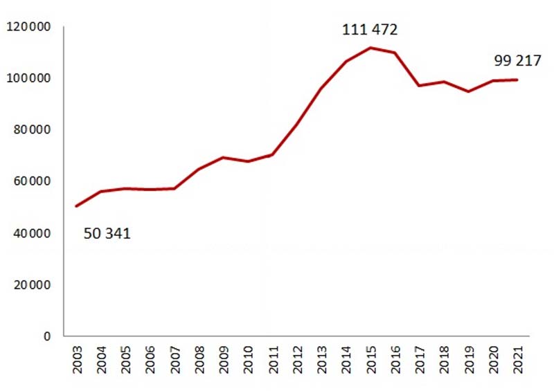 Escenario catastrófico para la CyT en México. Es claro que no estuvo en las prioridades de la administración federal anterior ni en la actual. Hay continuidad en el desfinanciamiento. Por otro lado, encontré algo confuso el párrafo sobre el presupuesto autorizado al ramo 38. Se menciona que en 2003 fue de 17.9 miles de millones a precios de 2020, el 0.52 % del gasto federal programable del año, y que sufrió un descenso todos los años para llegar en 2021 a 25.7 miles de millones de pesos de 2020, un 0.42 % del gasto programable. Entonces, a precios constantes no se observa el decrecimiento respecto de 2003, pero sí en el porcentaje de gasto programable. Saludos y felicitaciones por el análisis.
