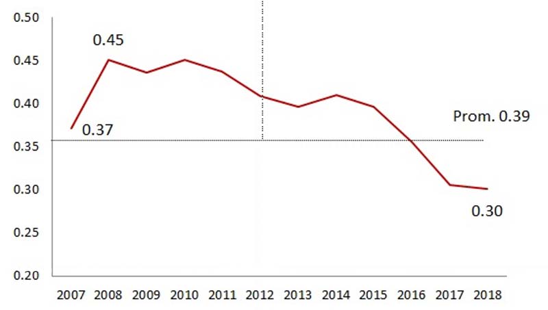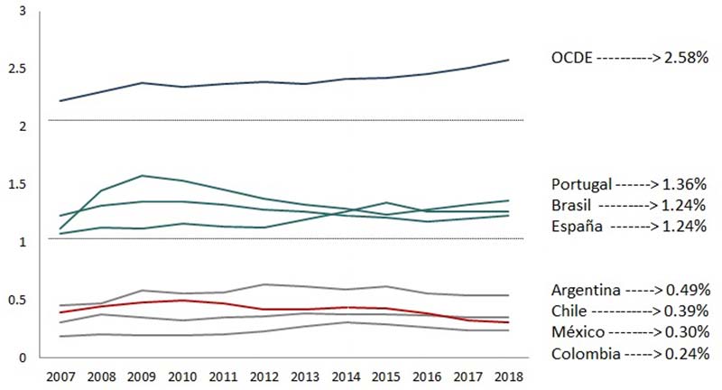 Como lo muestra la gráfica 4, uno de los indicadores cruciales para la ponderación de este indicador es su relación con el Producto Interno Bruto del país. A este respecto, se reconoce que en el periodo de 2008 a 2015 el GIDE/PIB de México osciló en torno al promedio de 0.4 % El dato más reciente al respecto indica que en 2018 la proporción correspondiente equivale a 0.3 %, lo que sitúa al país muy por debajo del promedio de la OCDE (2.6 %), inferior al de países como España (1.25 %) y Brasil (1.24 %) y aun a economías como las de Argentina (0.49 %) y Chile (0.39 %).