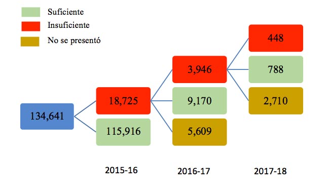 Entre la totalidad de docentes que se evaluaron en 2015, el 13.9% —esto es 18,725 docentes— obtuvo un resultado “insuficiente”, por lo que, de acuerdo con la Ley del SPD, debieron haber recibido una formación que abordara los déficits identificados por la evaluación y tenían que presentarse a una segunda evaluación un año después. El 70% de los docentes con resultados por debajo del mínimo en 2015 presentó esta segunda evaluación en 2016. El resto, 5,609, no lo hizo. Sin embargo, en el contexto de los desafíos de la gobernanza y transparencia del federalismo educativo en nuestro país, no se cuenta con información de cuántos de estos docentes justificaron su ausencia por motivos atendibles (por ejemplo, enfermedad, embarazo o alguna situación extraordinaria como un accidente u otro imprevisto de salud).