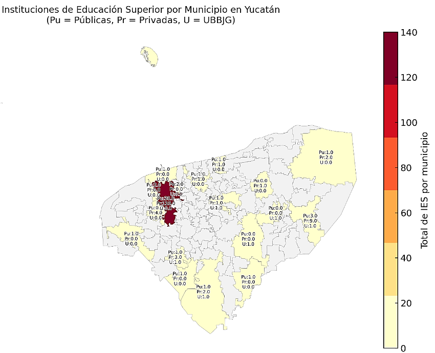 Por otro lado, en el ciclo escolar 2023-2024 se reportó un total de 181 IES: 134 privadas y 47 públicas, lo anterior sin sumar las UBBJ. Ya con las Universidades para el Bienestar da un total de 187 IES. A partir de este crecimiento sexenal, se sumaron tres municipios con su primera universidad tanto públicas y privadas (Cenotillo, Tinum y Yaxcabá). En el caso de Valladolid se abrió 2 campi privados, mientras que Tekax 1 campus, y Uman como único municipio que posee oferta de ES privada (4 en total).
