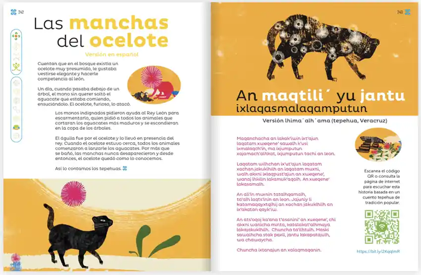La contundencia de un material educativo radica en la forma en que se didactiza el contenido. A través del concepto de transposición didáctica, Yves Chevallard refiere que el saber sabio o saber científico es seleccionado, reconstruido y adaptado para ser enseñado en un contexto educativo. En el libro de Múltiples lenguajes se muestran seis textos en lenguas originarias, de los cuales tres son narraciones; dos, canciones y uno, diálogo. La selección de los textos, aunque variada, es demasiado extensa. Específicamente, las tres narraciones relatan hechos con personajes, en un tiempo y en un espacio definidos. Si bien la temática interesa al alumnado pues se ofrecen historias fantásticas, existen sustantivos que quizá no les resulten familiares, de entre las cuales encontramos “testículos”, “mixes”, “ocelote” o adjetivos como “indignado”. Estos elementos son importantes si se considera que el libro va dirigido a estudiantes de entre seis a siete años. La disposición de los textos es la siguiente: en primer lugar, se muestra el texto en la versión en español; en seguida, el texto en lengua originaria. A reserva de que el profesorado ofrezca la instrucción, en el libro se carece de una indicación específica.