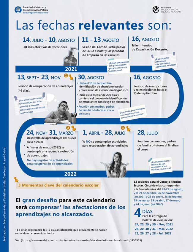 Ciertamente, el calendario escolar es un instrumento de ordenamiento de procesos educativos. Pero, como señaló la secretaria Gómez, debe ser concebido como parte clave de los aspectos académicos. No obstante, en el anuncio de la SEP es evidente que el calendario no sólo implica procedimientos, sino también políticas educativas que demandan precisiones y decisiones de la autoridad. ¿Cómo se coordinarán para implementar el calendario las autoridades educativas estatales y la autoridad educativa federal de Ciudad de México? Un calendario, entre otros objetivos, busca dar certidumbre a las comunidades educativas sobre la secuencia y el alcance de su trabajo. Pero, ante un escenario de incertidumbre frente al covid-19, es urgente el desarrollo de los componentes señalados en este texto para disminuir los espacios de duda, vacío y especulación.