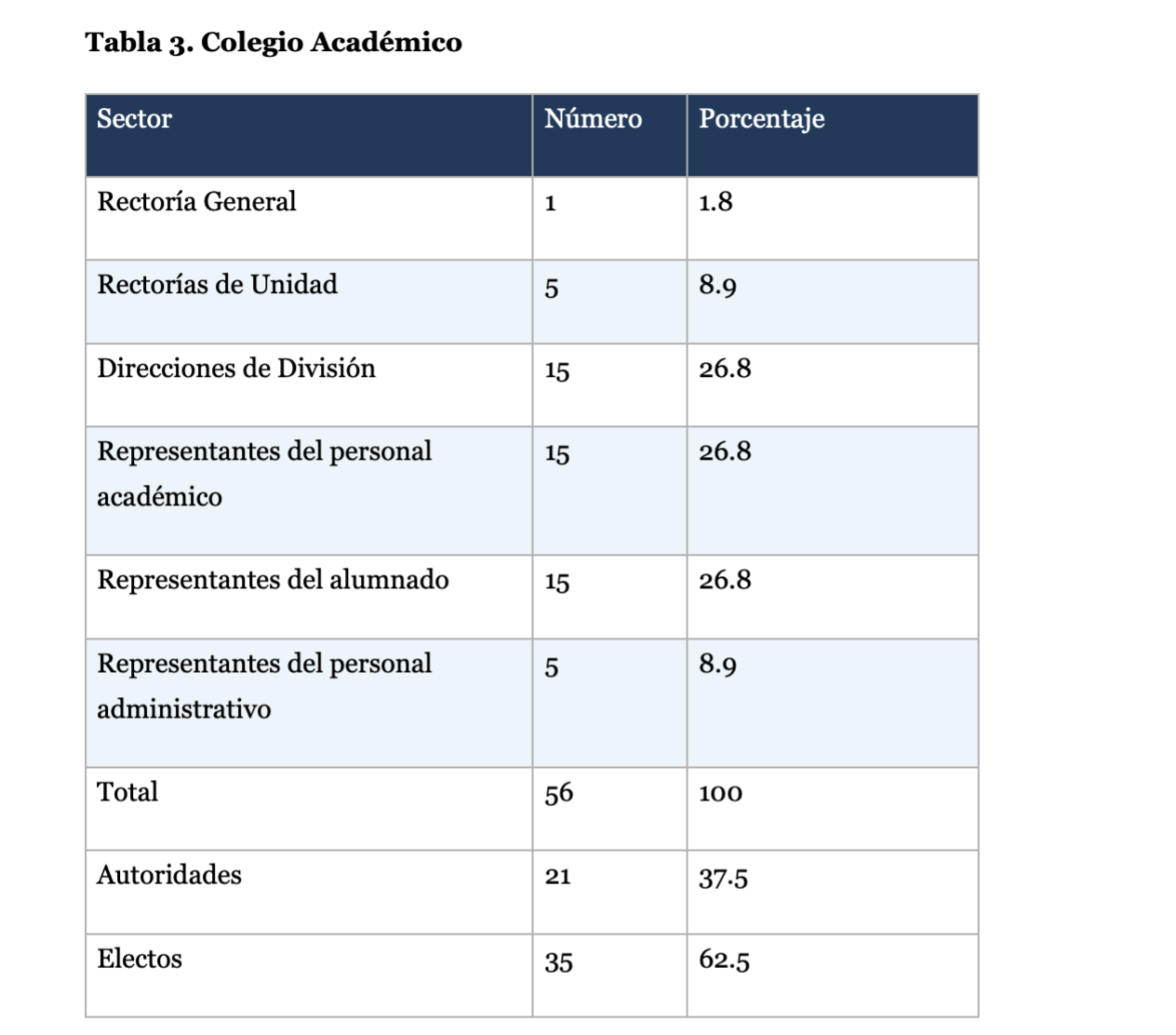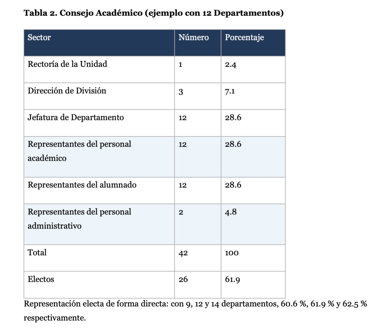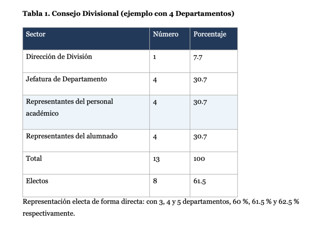 La representación del personal académico y el alumnado (en CD y CA) y del personal administrativo (en CA) se elige mediante voto libre, universal, secreto, personal y directo. Cada CA elige, de entre sus integrantes, a tres del personal académico, tres del alumnado y uno del personal administrativo que lo representarán ante el CoAc. Así, en los tres órganos colegiados la proporción sumada de la representación de los distintos sectores es de entre 60 % y 62.5 % (Tablas 1 a 3).