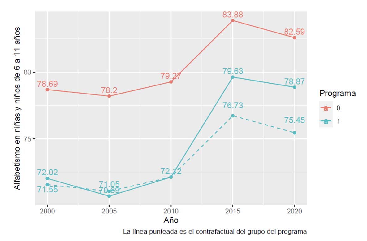 ¿Cómo ocurrió esto? Porque, además, incrementó la asistencia escolar de niñas y niños de 6 a 11 años en 1.31 puntos porcentuales por municipio, en promedio. A continuación, se presentan los resultados del modelo, así como la gráfica que muestra el comportamiento de los grupos (control y programa), en comparación con el contrafactual que es la línea punteada.