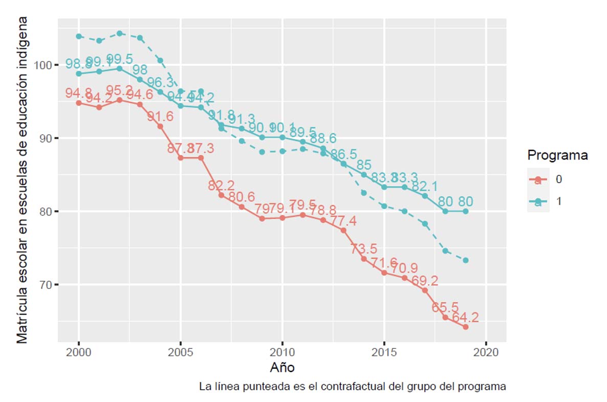 Las tablas de regresión se encuentran disponibles en el repositorio pero, como referencia visual, a continuación se muestra el comportamiento de los grupos entre 2000 y 2020, estimando el efecto del programa a partir de la curva del supuesto de tendencias paralelas: es decir, qué hubiera pasado si los municipios del programa no hubieran percibido estos subsidios (siguiendo la tendencia del grupo de control). La diferencia entre la curva punteada que representa el contrafactual y la curva azul que representa al grupo de tratamiento es el efecto del programa.