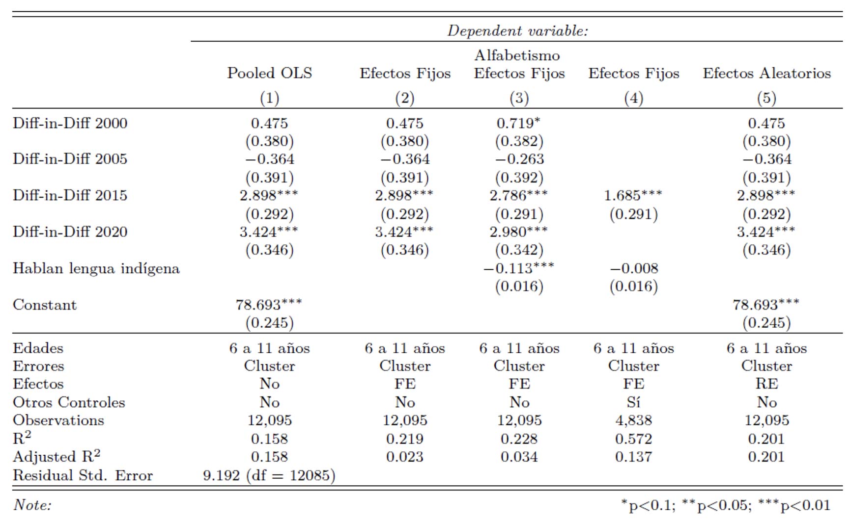 Tabla 1. Modelo de Diferencias en Diferencias sobre alfabetismo por municipio