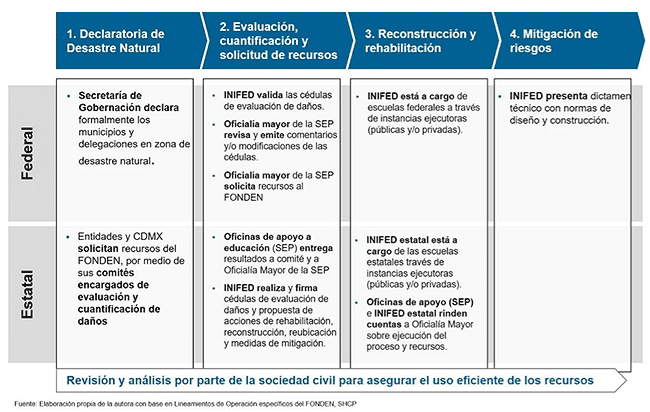 Para que las escuelas sean reconstruidas y rehabilitadas con recursos del Fonden se debería de seguir el mecanismo anterior. Se trata de un proceso que especifica con claridad los responsables y acciones en cada etapa. Sin embargo, en términos de transparencia y rendición de cuentas, es un mecanismo con muchos asegunes.